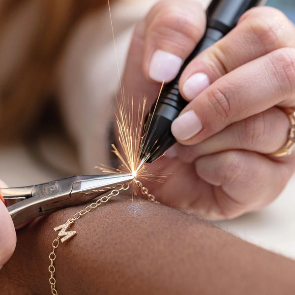 The goldsmith will use the welding machine to permanently join your Bracelet, Anklet or Necklace. The machine works by using electrical energy to create a plasma charge. The high temperature of the plasma melts and joins the metal together.